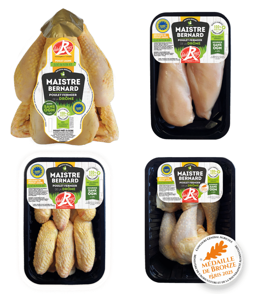 Toutes nos volailles sont nées, élevées et abattues en France mais pas seulement … « Le poulet de ma Région « est élevé en Région Auvergne-Rhône-Alpes et départements limitrophes. Notre gamme Label Rouge bénéficie de l’IGP Drôme. Enfin, « Le Poulet de Mon Enfance » est encore plus ciblé localement car né en Isère, élevé en Drôme et Ardèche.